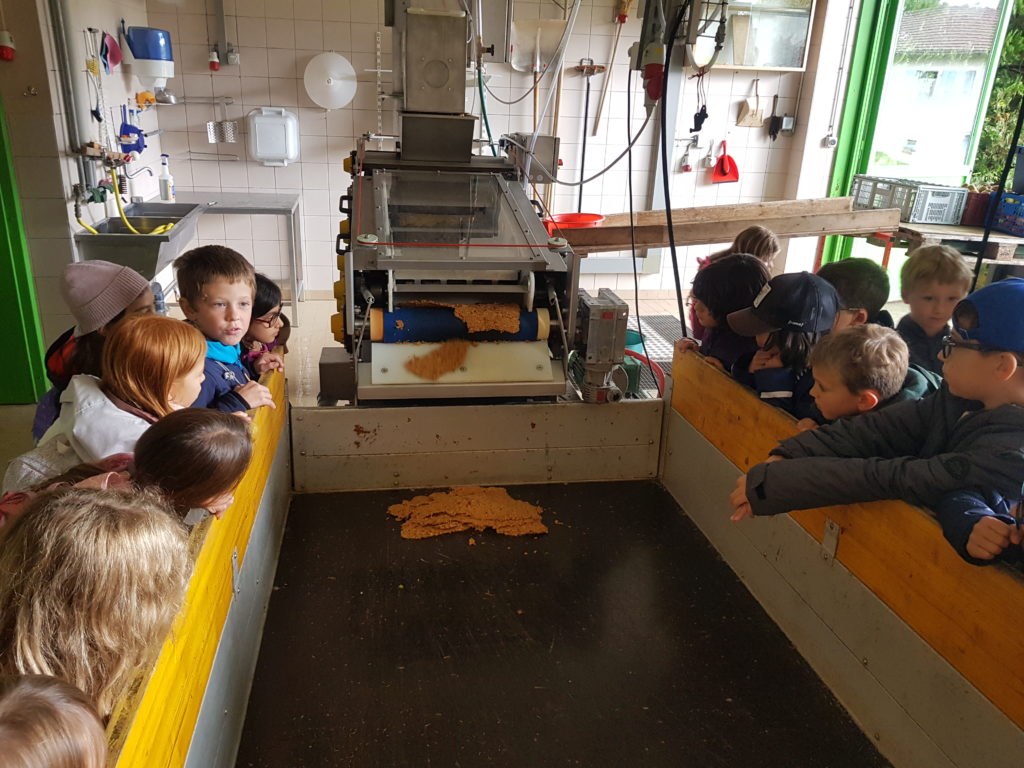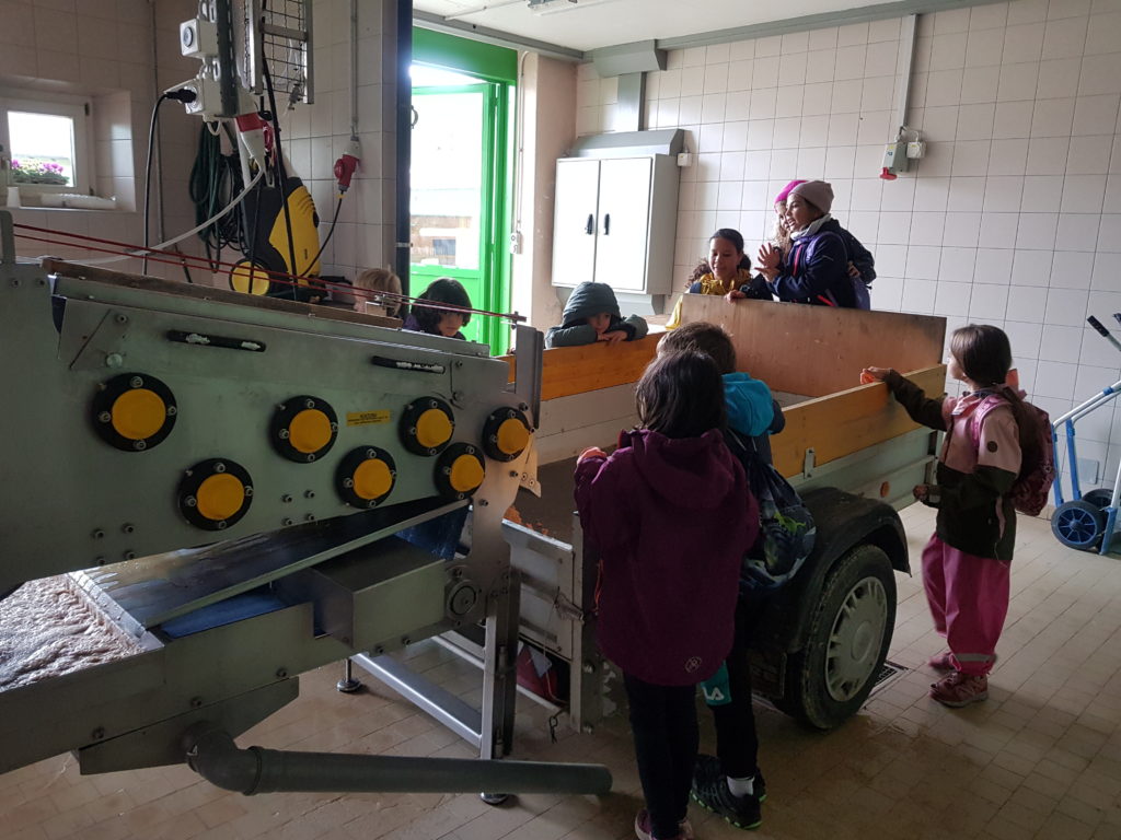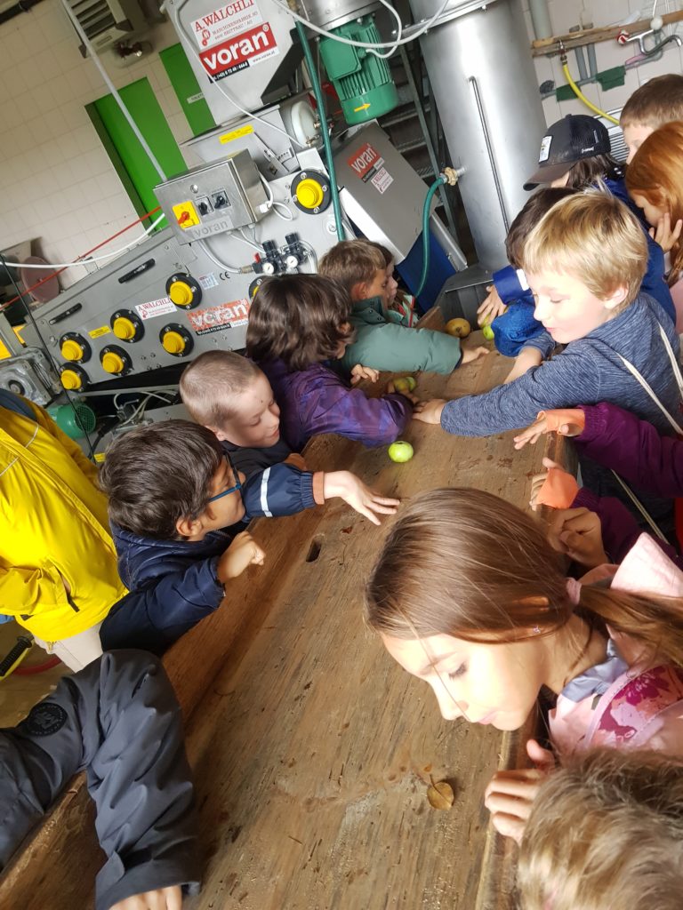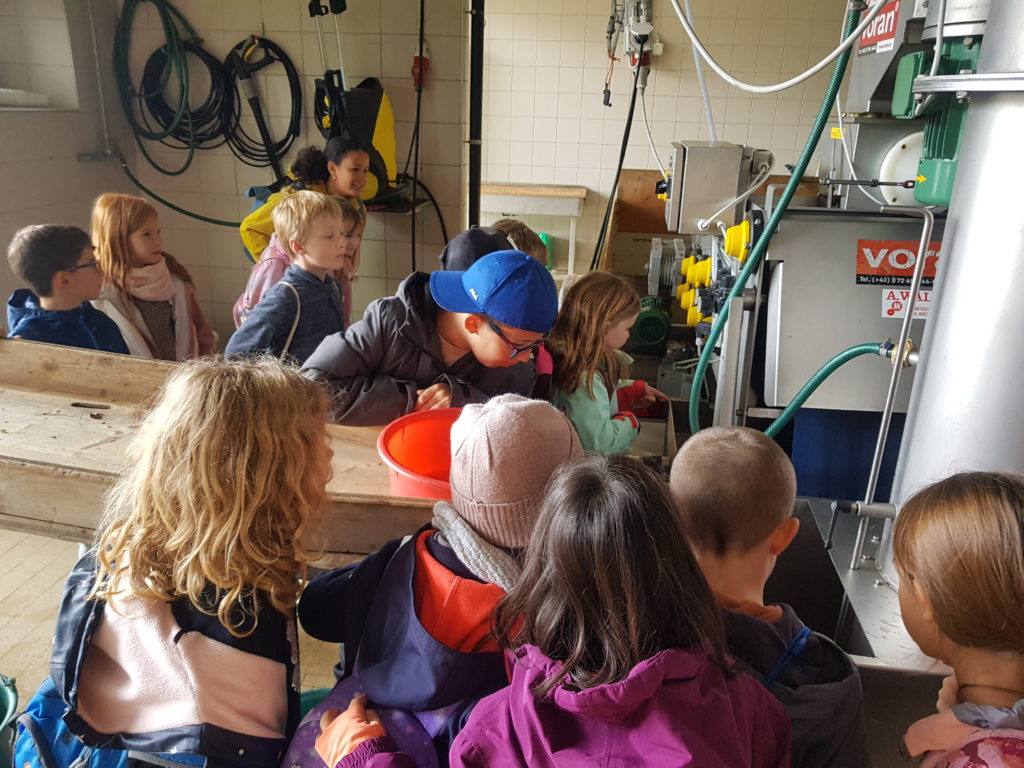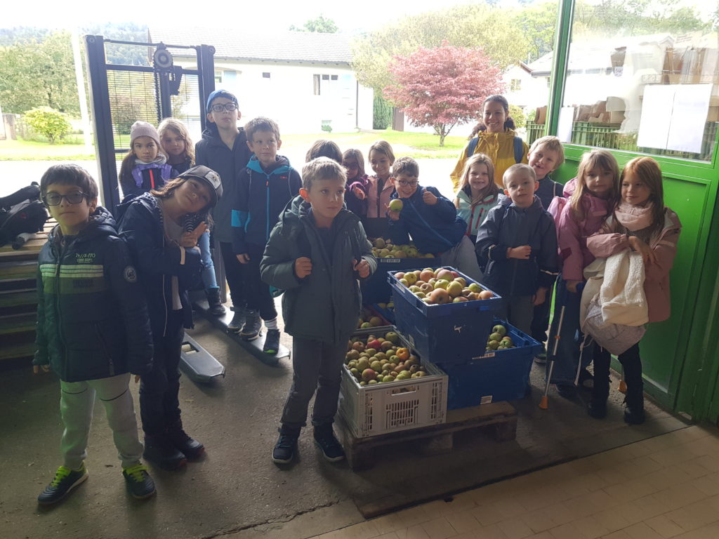 Nous avons ramassĂ© les pommes de la cour d’Ă©cole, c’Ă©tait trop rigolo de monter sur l’Ă©chelle. Puis, nous avons amenĂ© nos pommes au pressoir de Charmoille. La machine Ă©tait grande et faisait beaucoup de bruit : on a adorĂ© trier les pommes et regarder le jus couler. A la fin, on a mĂŞme pu goĂ»ter le jus de pomme, c’Ă©tait le meilleur !
