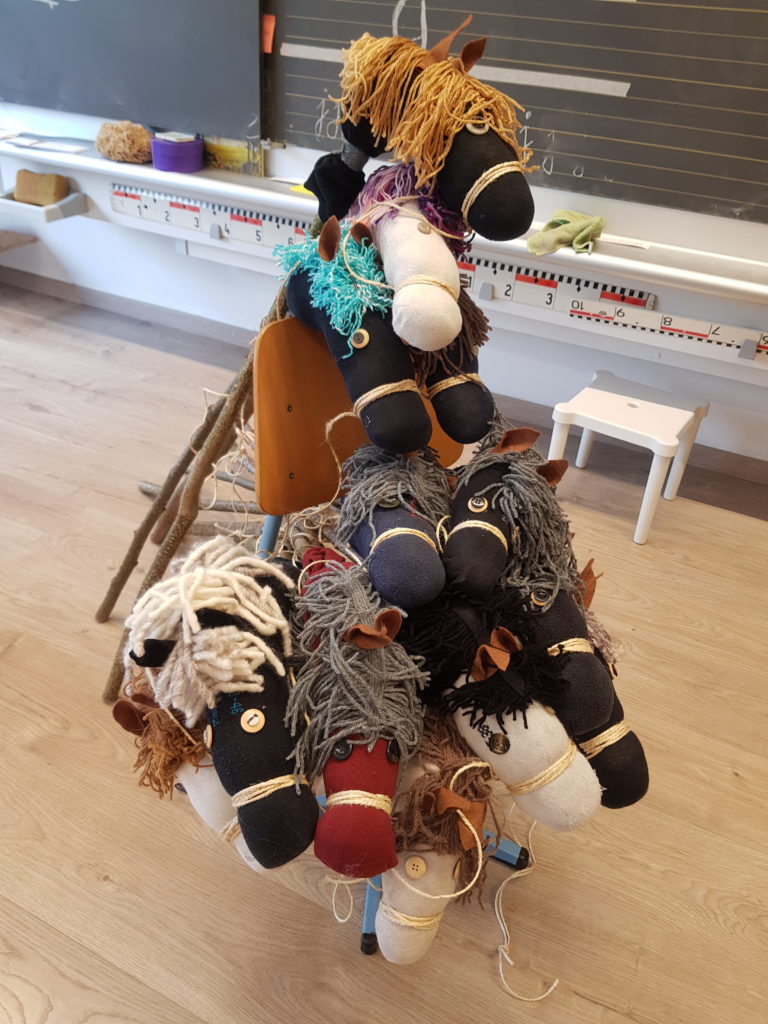 A partir de vieilles chaussettes, nous avons fabriquĂ© des magnifiques chevaux pour tous les chevaliers de la classe. Nous avons mĂŞme fait une grande course dans la cour d’Ă©cole.