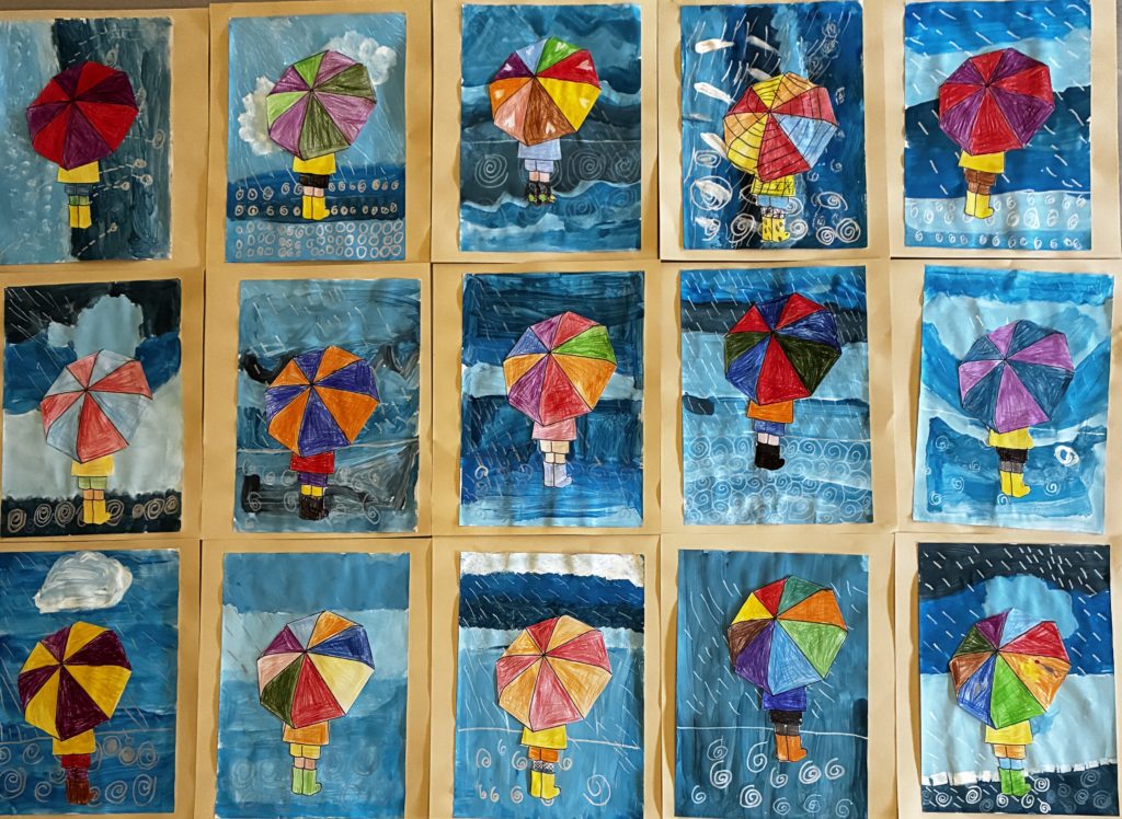 En attendant de pouvoir jouer dans la neige, nous nous sommes dessinés sous la pluie en utilisant différentes techniques et nous avons adoré faire cela.