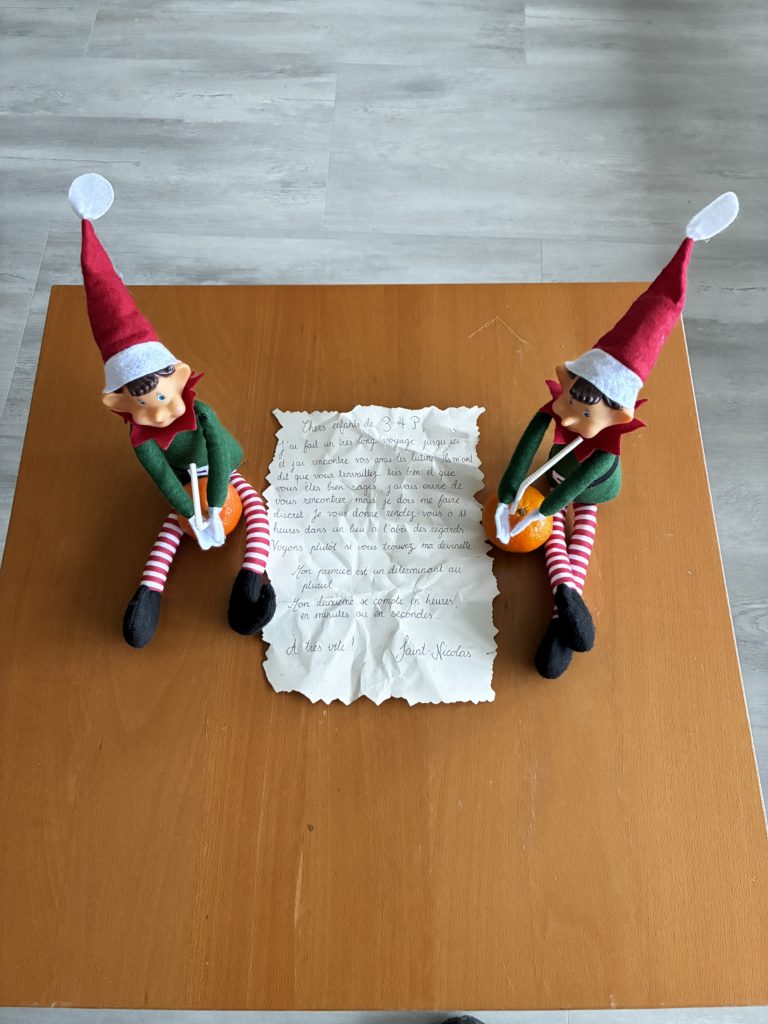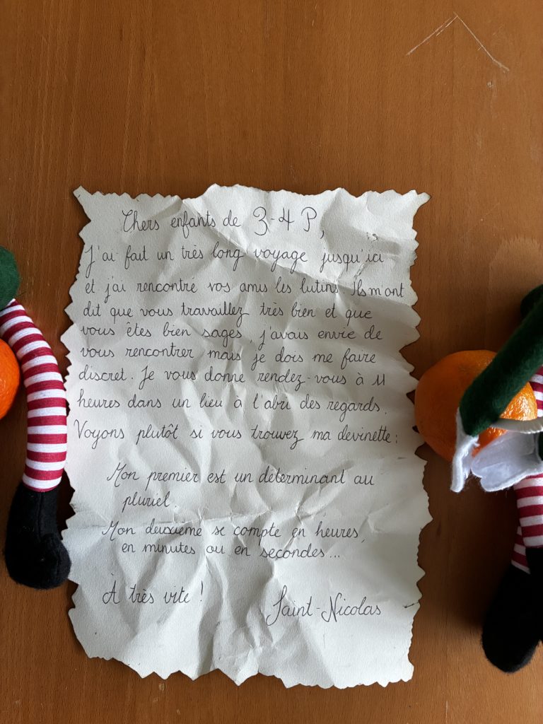 Ce vendredi matin, les lutins avaient une lettre de Saint-Nicolas Ă notre attention. Incroyable: Saint-Nicolas nous donnait rendez-vous dans un endroit que nous devions deviner.