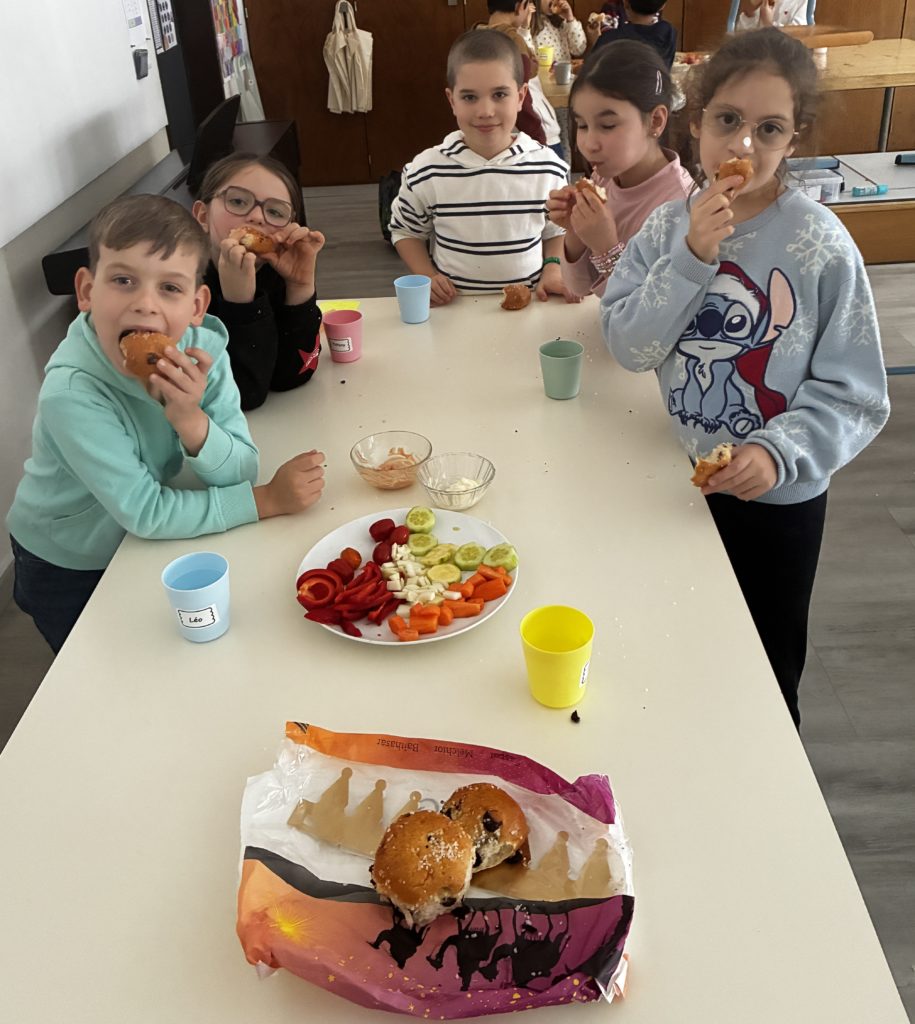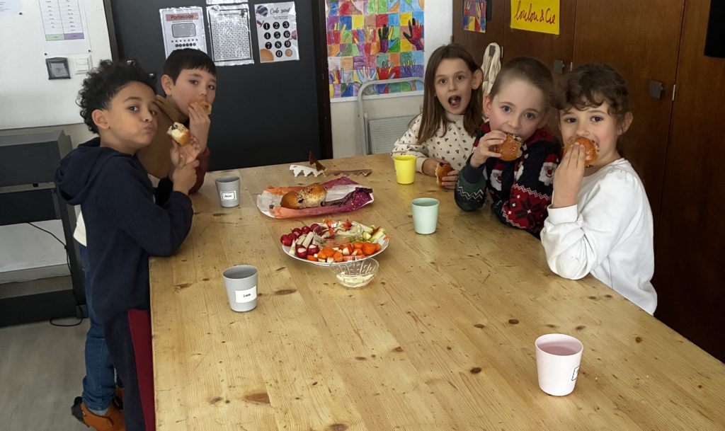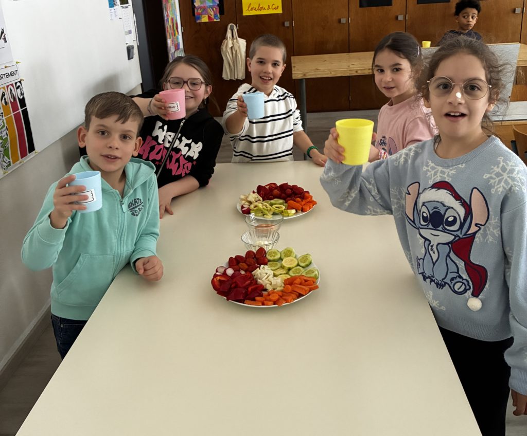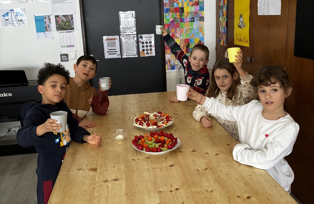 Dans notre classe, nous avons fĂŞtĂ© les anniversaires. Les enfants concernĂ©s ont voulu faire un apĂ©ro-lĂ©gumes. Cela tombait bien puisque les Ă©lèves de 3P venaient de bĂ©nĂ©ficier de leçons d’Ă©ducation alimentaire: la pyramide peut donc ĂŞtre fière de nous ….. Nous avons cuisinĂ© en classe le 06 janvier: nous avons Ă©pluchĂ© et coupĂ© des lĂ©gumes, dĂ©corĂ© les plats le plus joliment possible. Nous nous sommes dit : « santé » et nous avons tout mangĂ© nos lĂ©gumes (avec un peu de mayonnaise tout de mĂŞme!) Evidemment, on ne pouvait pas oublier le dessert. Nous avons encore mangĂ© la galette des rois. C’Ă©tait gĂ©nial!