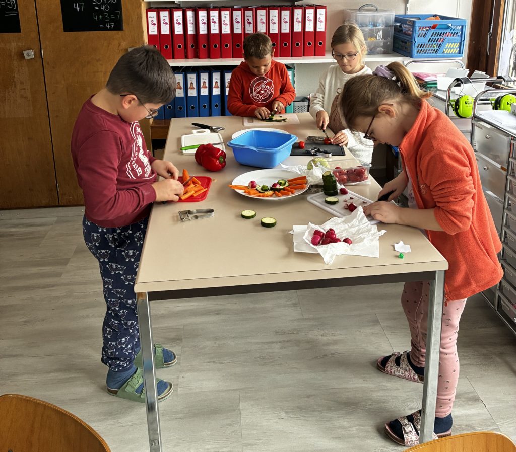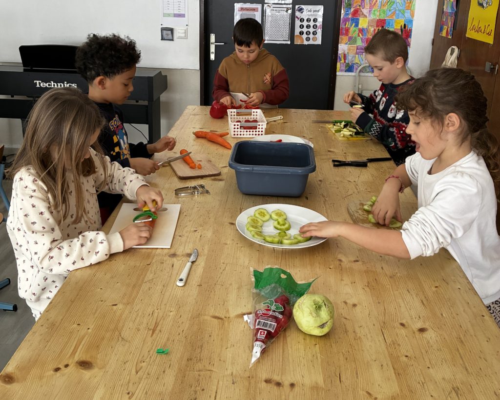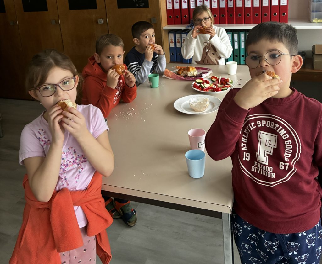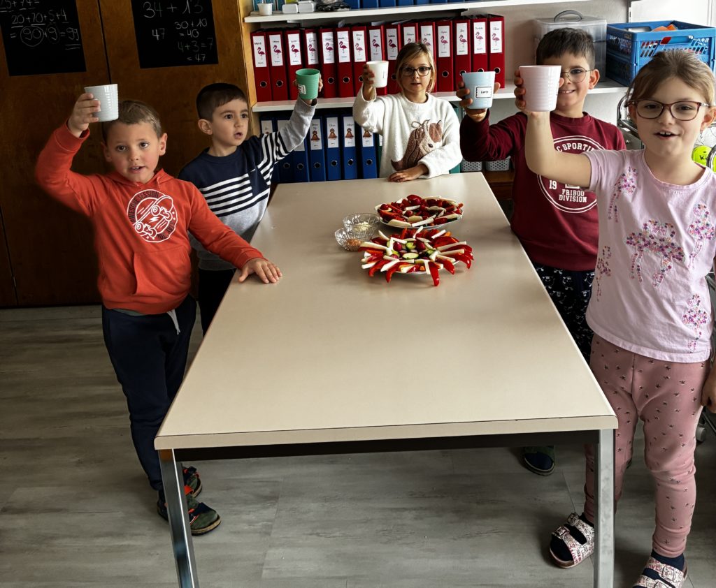 Dans notre classe, nous avons fĂŞtĂ© les anniversaires. Les enfants concernĂ©s ont voulu faire un apĂ©ro-lĂ©gumes. Cela tombait bien puisque les Ă©lèves de 3P venaient de bĂ©nĂ©ficier de leçons d’Ă©ducation alimentaire: la pyramide peut donc ĂŞtre fière de nous ….. Nous avons cuisinĂ© en classe le 06 janvier: nous avons Ă©pluchĂ© et coupĂ© des lĂ©gumes, dĂ©corĂ© les plats le plus joliment possible. Nous nous sommes dit : « santé » et nous avons tout mangĂ© nos lĂ©gumes (avec un peu de mayonnaise tout de mĂŞme!) Evidemment, on ne pouvait pas oublier le dessert. Nous avons encore mangĂ© la galette des rois. C’Ă©tait gĂ©nial!
