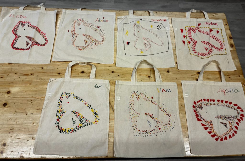 Voici nos sacs dĂ©corĂ©s avec un joli loup. Ces sacs, gardĂ©s dans notre classe, nous accompagnent jusqu’en 8P. Ils servent Ă faire transiter nos affaires de l’Ă©cole Ă la maison et inversement lorsque nous sommes malades.