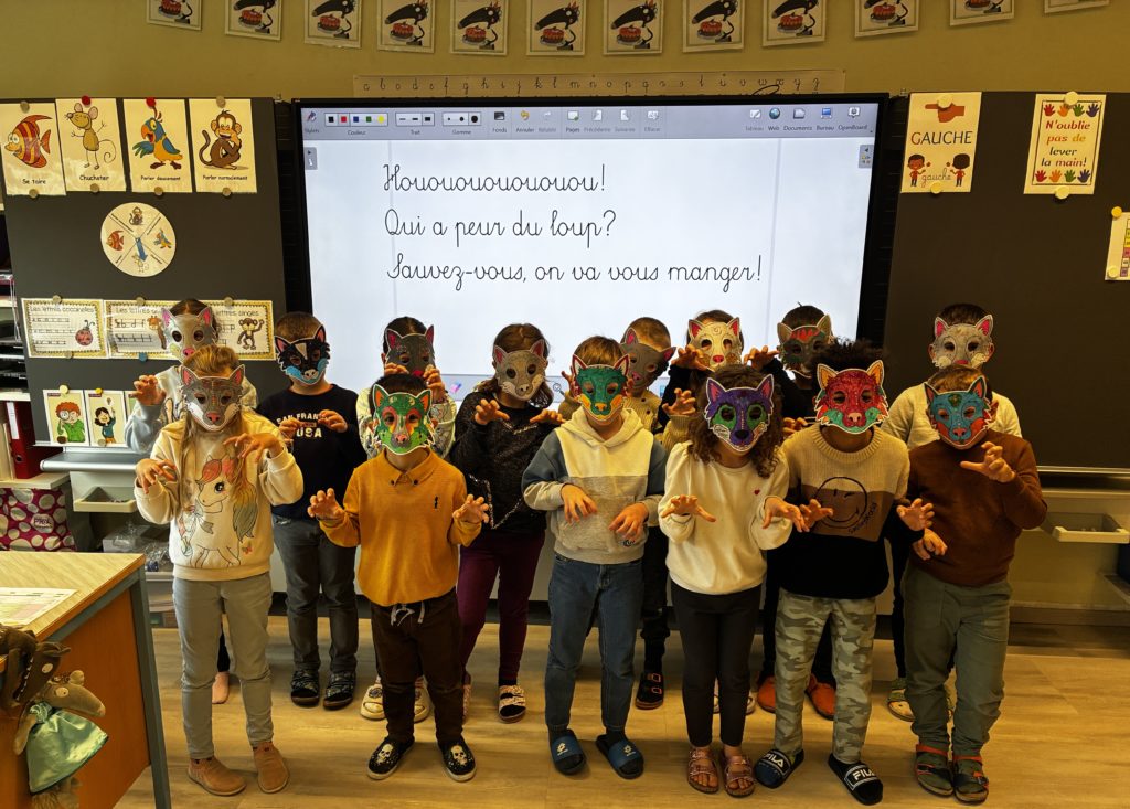 Pour terminer, nous avons fabriqué des masques de loup en classe durant la leçon de bricolage. On espère bien vous faire peur!
