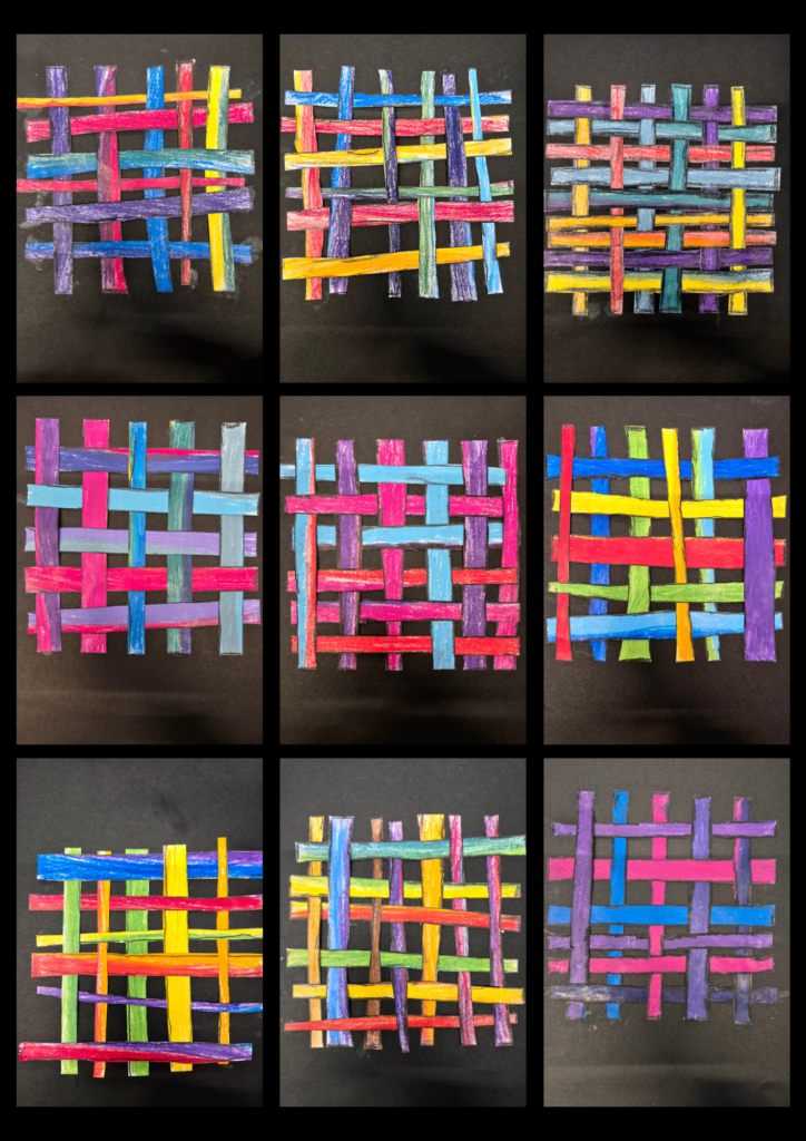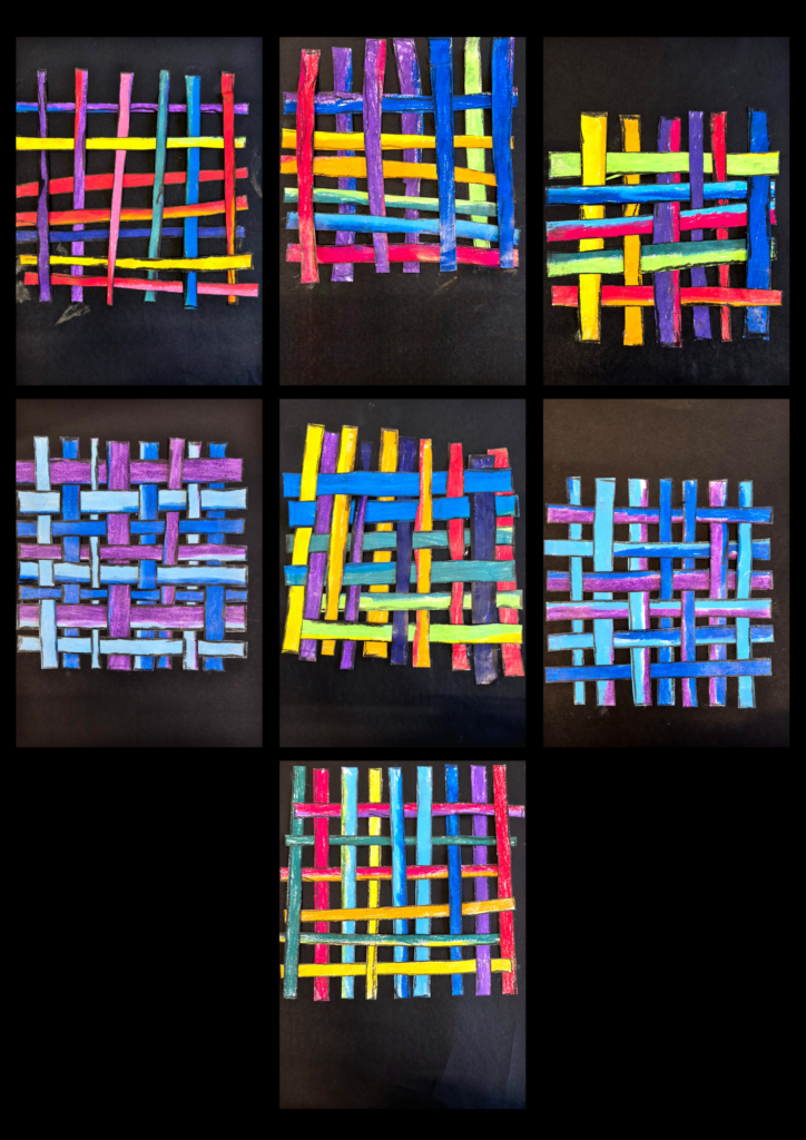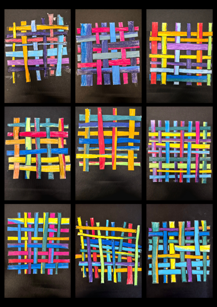 Nous nous sommes sali les mains avec des pastels gras mais le résultat en vaut le coup. Cette œuvre a été faite en tissant des bandes de papier. Les bandes passent dessus et dessous pour créer un joli motif coloré.