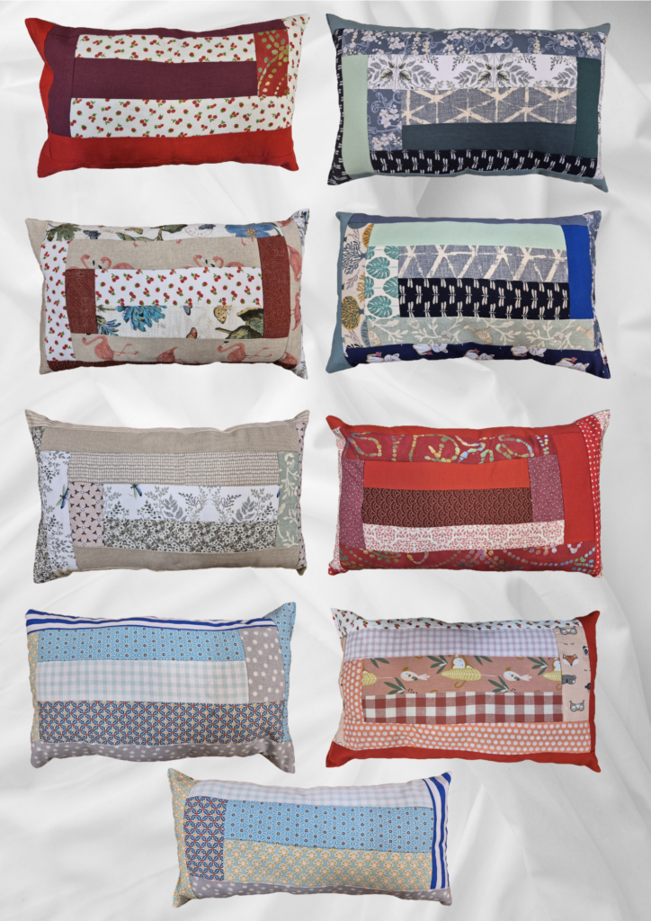 Pour ce projet, nous avons choisi les tissus, découpé des bandes, cousu et créé un motif simple mais personnel. Le résultat est un coussin unique, coloré et fait avec soin. Nous nous réjouissons de dormir avec !
