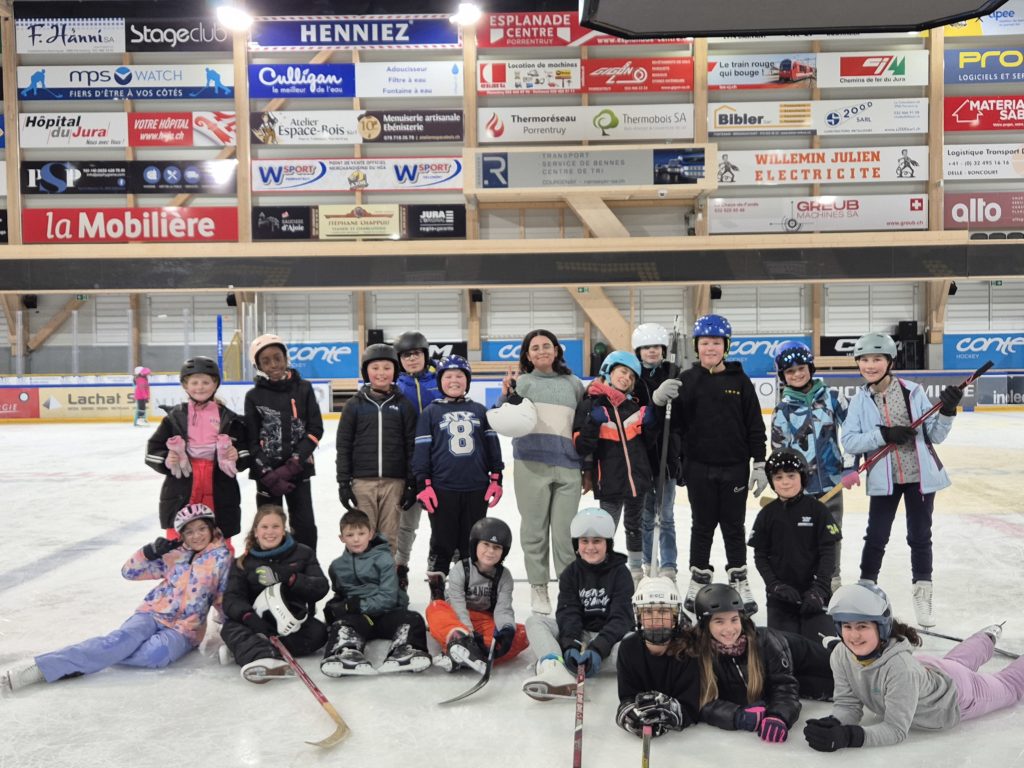 Pour notre dernière sortie à la patinoire, nous avons pu aller sur le grand champ de glace, là où se déroulent les matchs du HC Ajoie. C’était super !