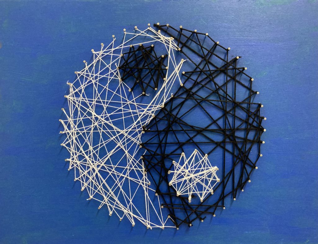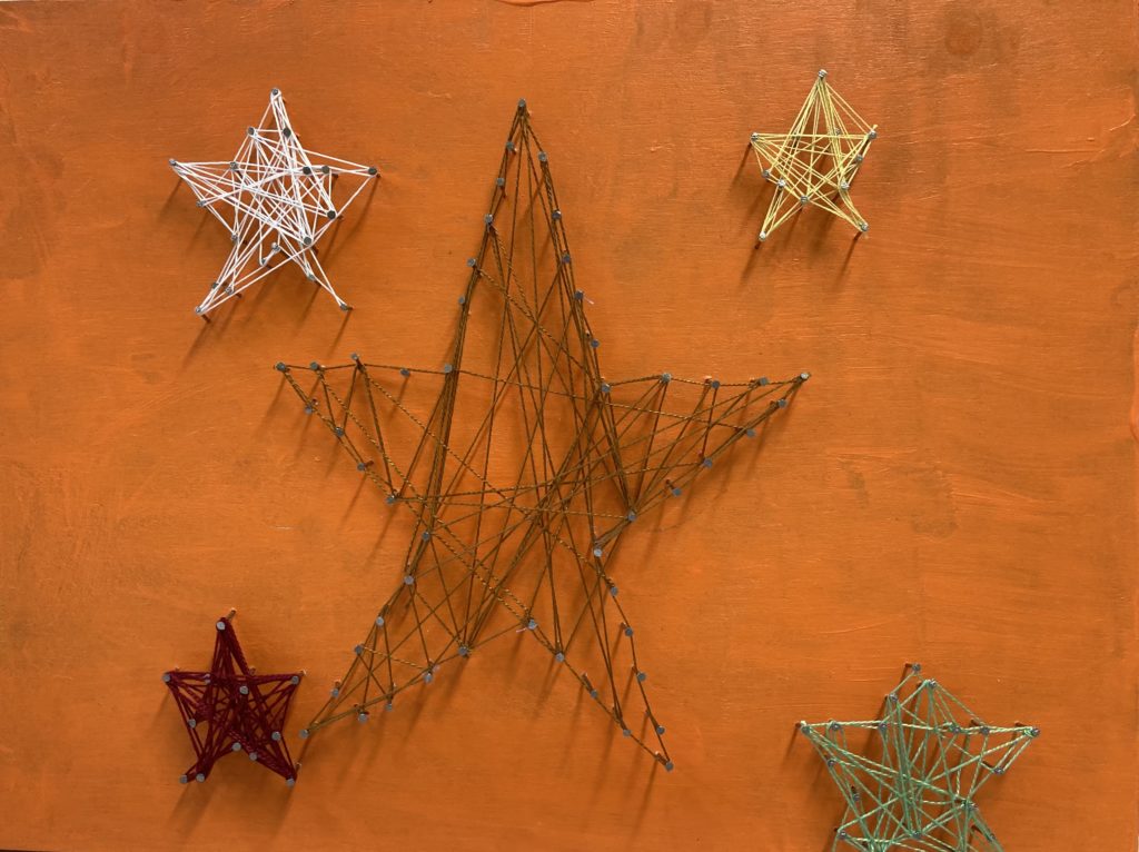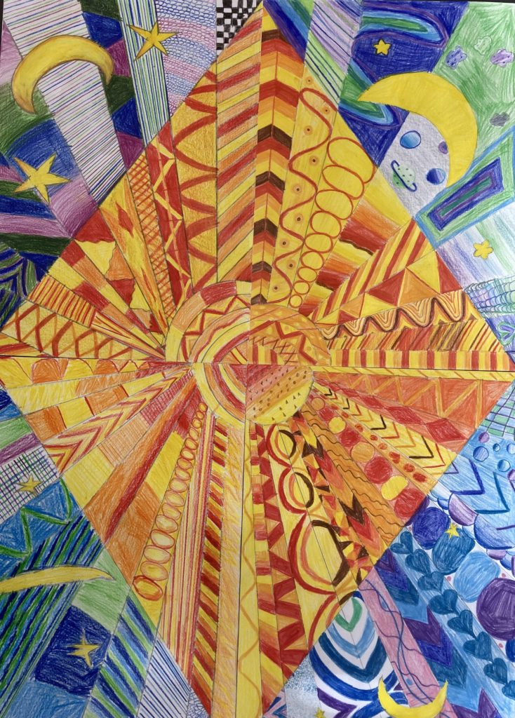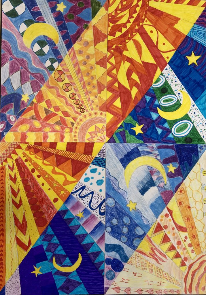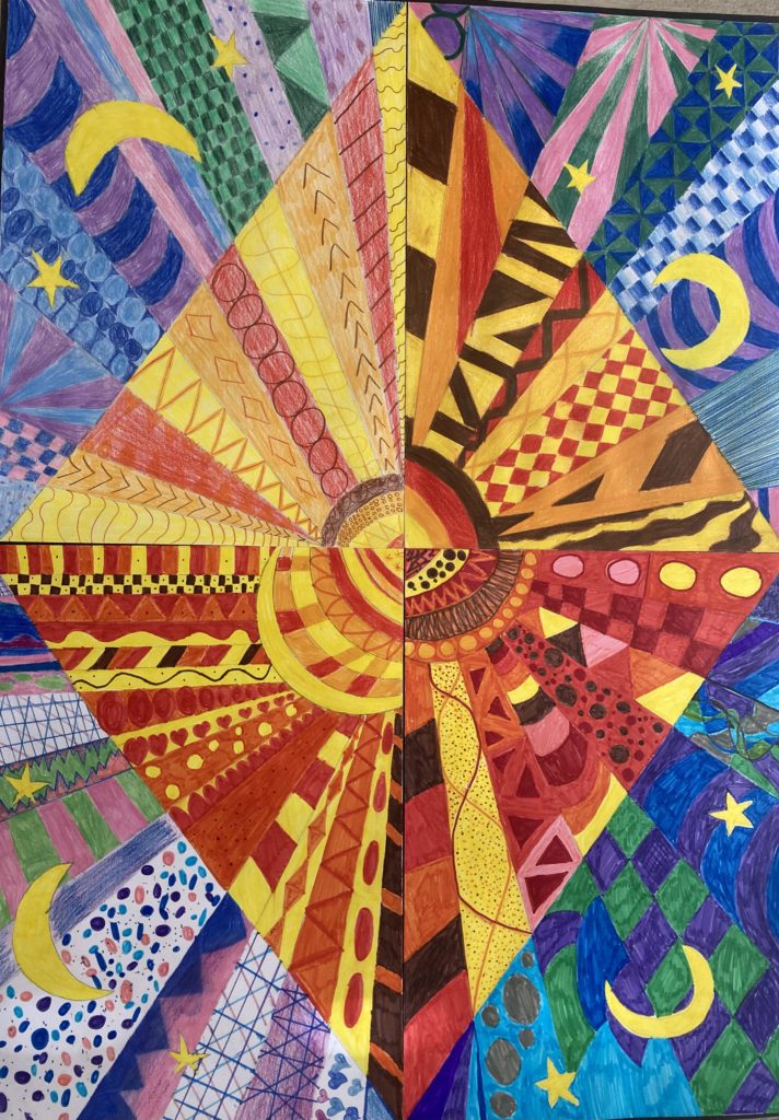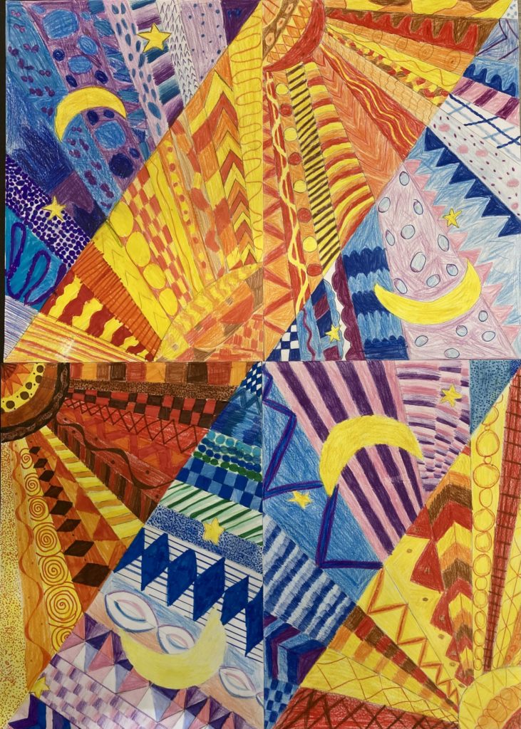 Dessins collectifs sur le thème du jour et de la nuit, couleurs chaudes et froides.