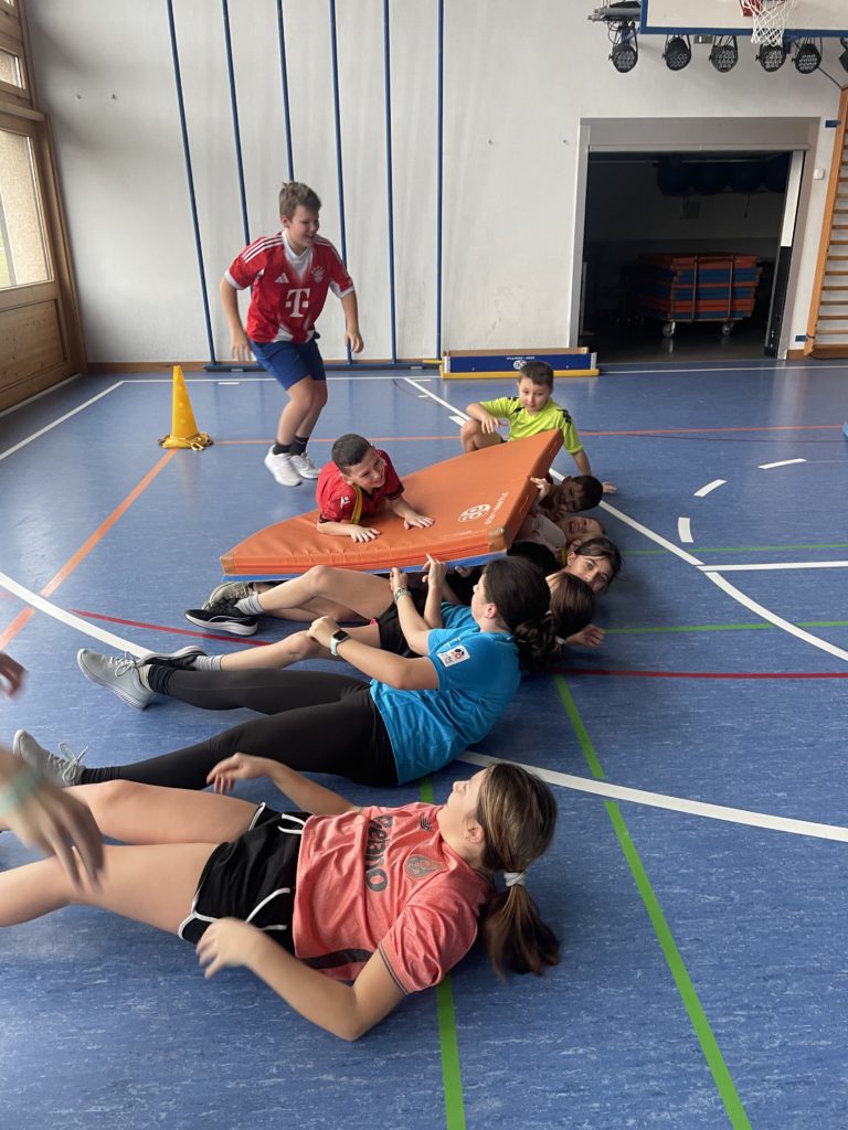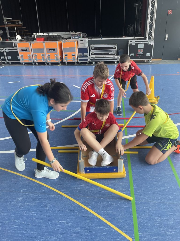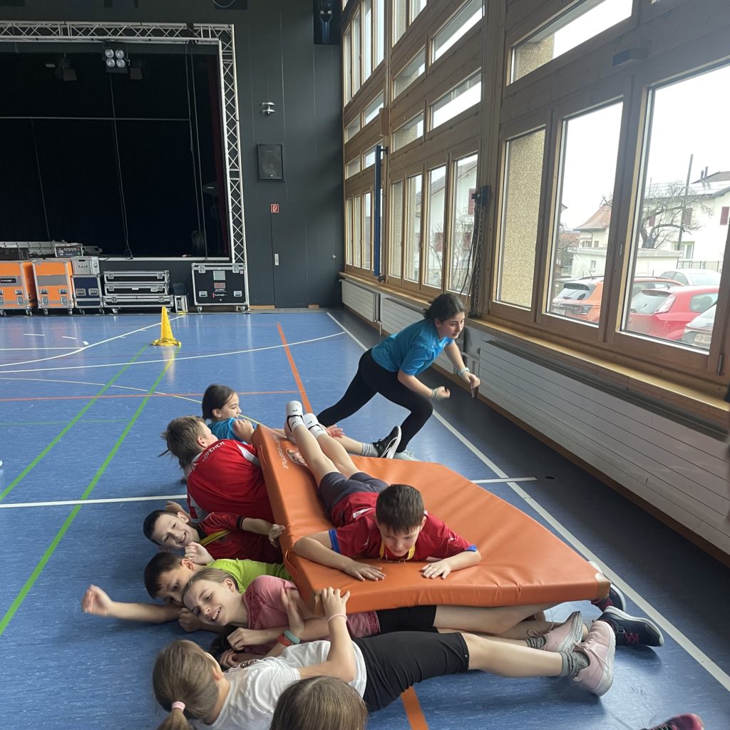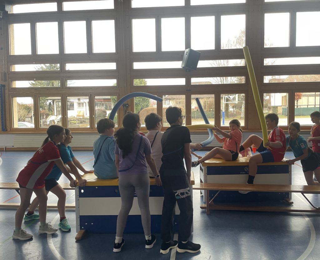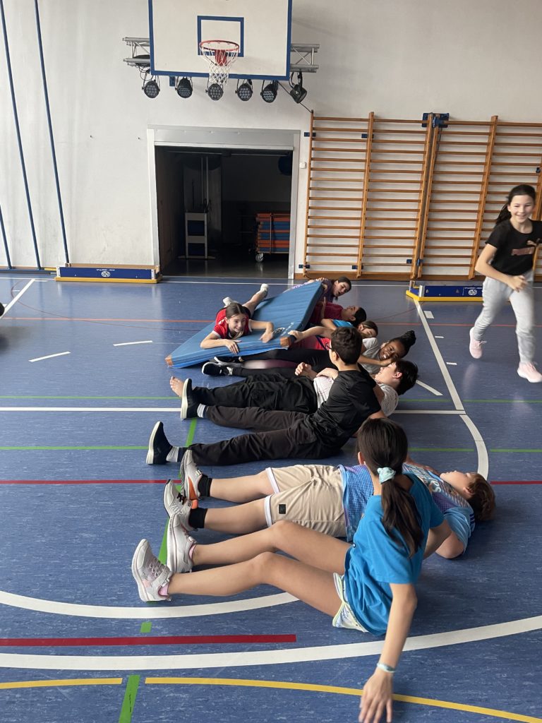 Les élèves de 7P-8P ont participé à une gym leur demandant de collaborer. Dans un premier temps, les élèves devaient se coordonner et définir les rôles de chacun afin de faire avancer le navire contenant deux de leurs camarades. Par la suite, les élèves ont dû à nouveau faire avancer un de leur camarade tel Aladin sur son tapis magique. Puis pour terminer, les deux équipes se sont départagées lors d’une rencontre chevaleresque. Chaque équipe a dû déplacer ses deux chevaliers équipés de leur lance ainsi que de leur trésor afin de faire tomber les trésors de l’autre équipe.